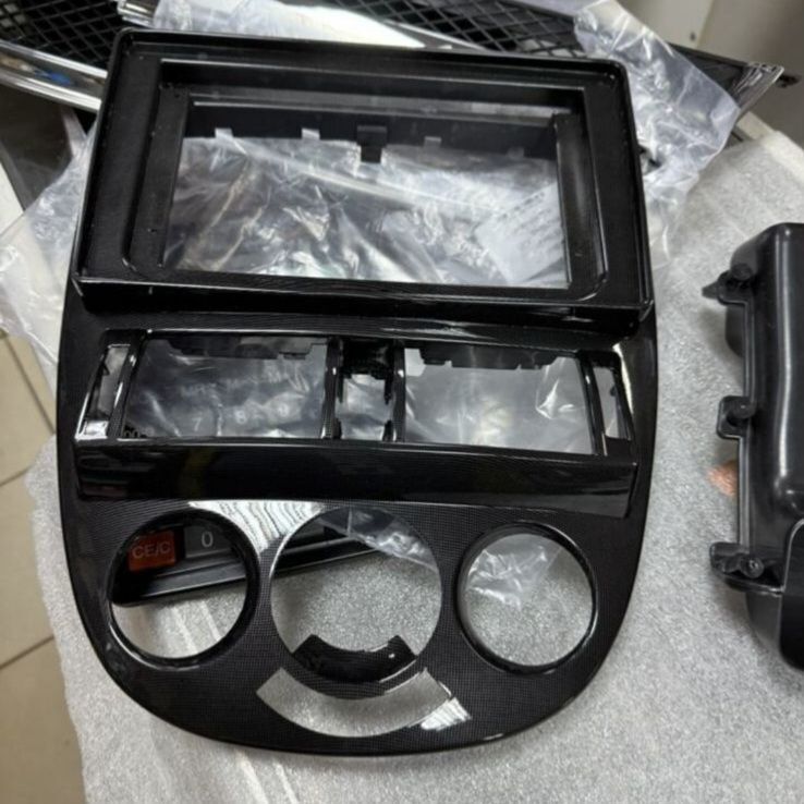 Переходная рамка для автомагнитолы на Лачетти Джентра. Расцветка аквамарин, похоже на карбон. В комплекте переходной корпус для перенаправления потока воздуха печки, так как отверстия находятся ниже, под экраном. Подходят автомагнитолы 10 дюймов.
